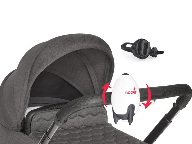 Le Rockit Rocker se fixe solidement à la poignée ou au châssis de la poussette grâce à son système d’attache sécurisé.